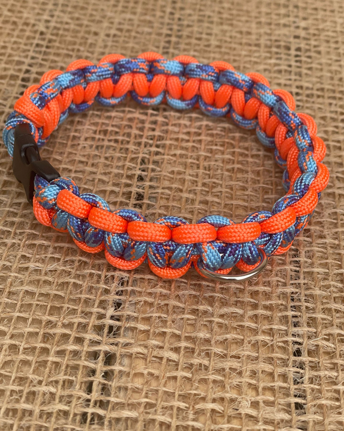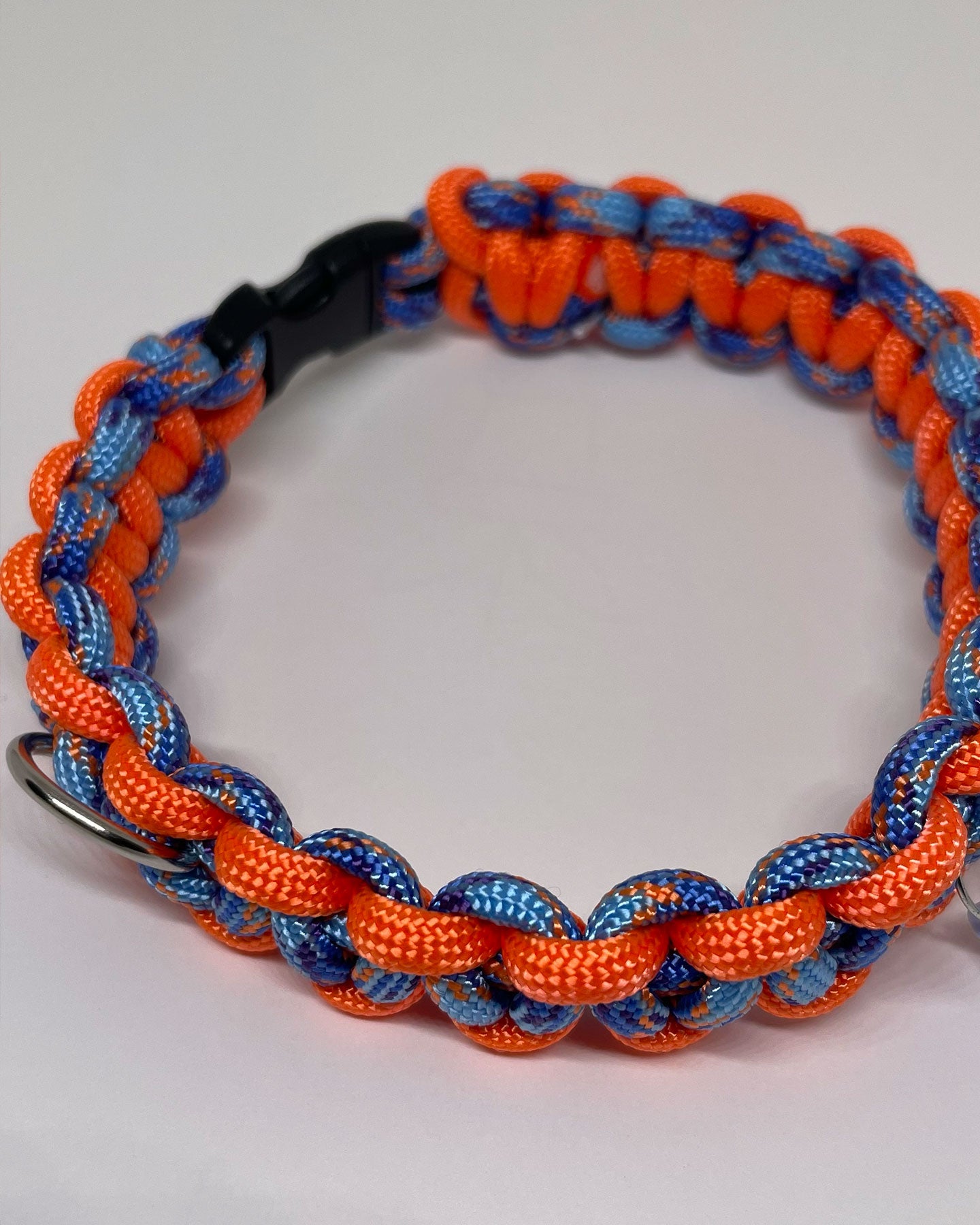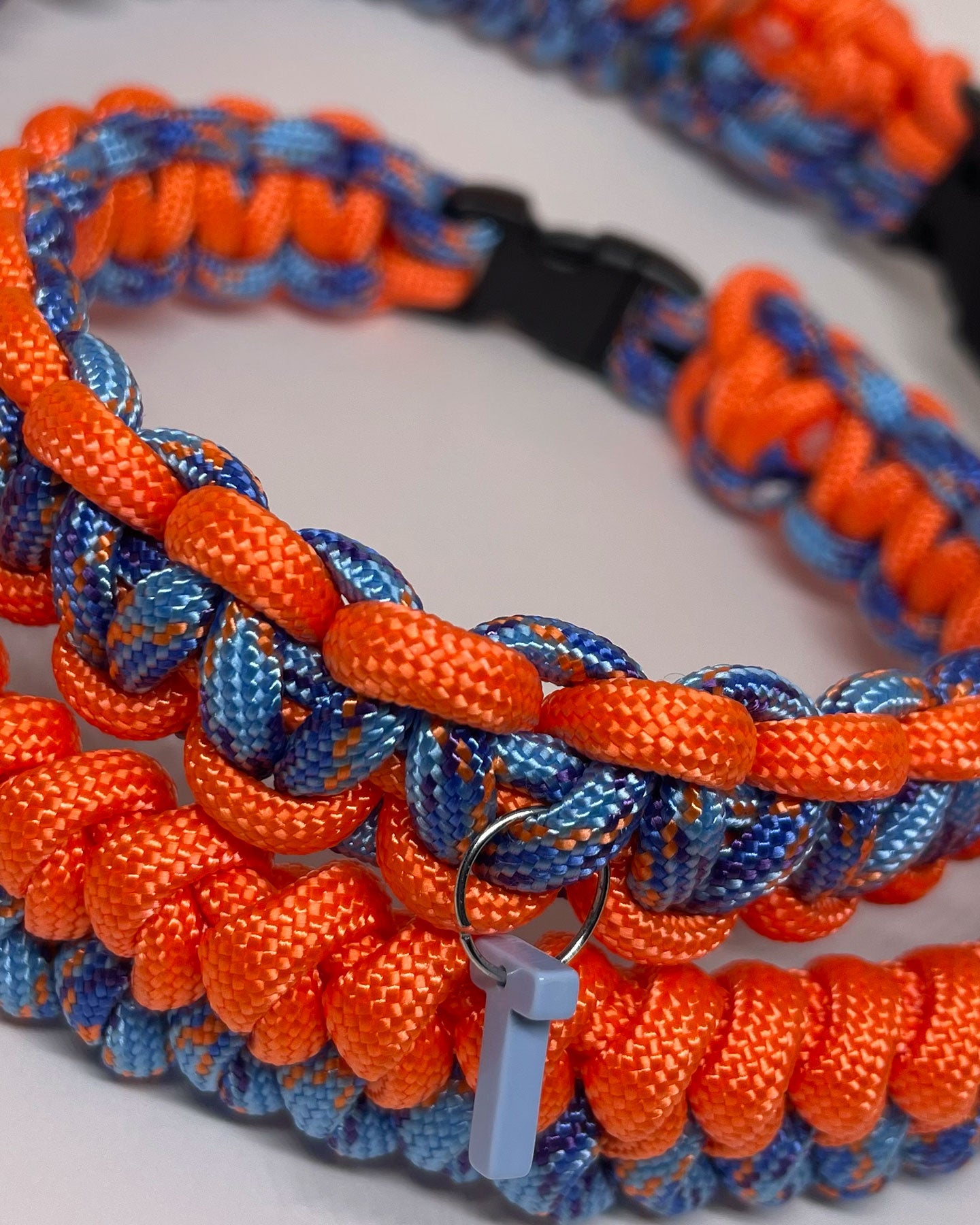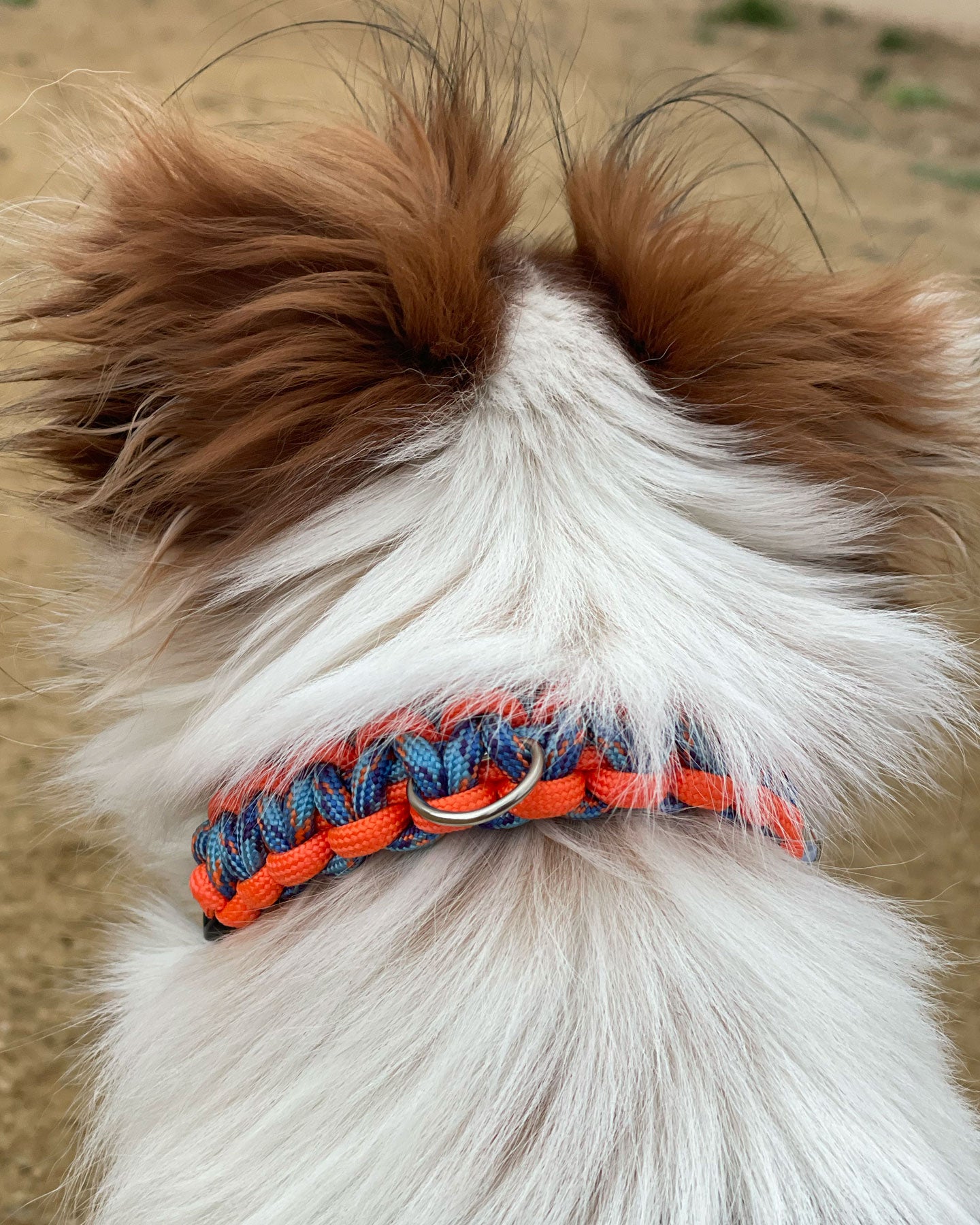 ¡Aquí está el Collar Tapón! Tejido con Paracord (un cordón de paracaídas) y mucho amor, es perfecto para peludos pequeños y medianos. ¡Personalízalo como quieras con tus colores favoritos y una inicial opcional!